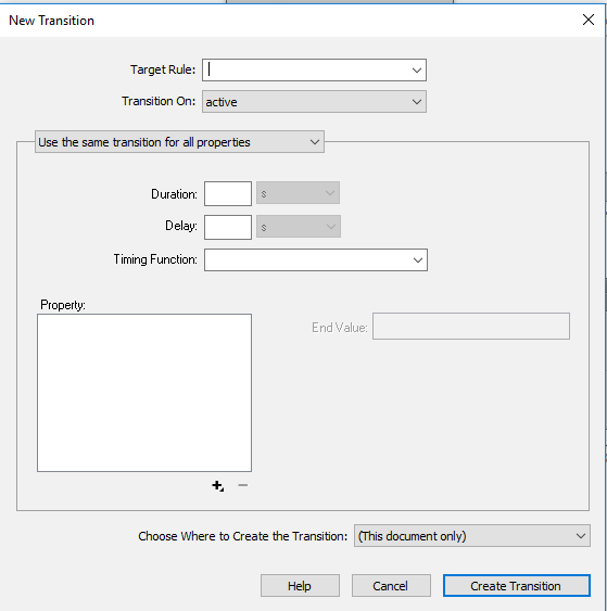 - Open the CSS Transitions panel and click the + button. This will open the New Transition window (see below)